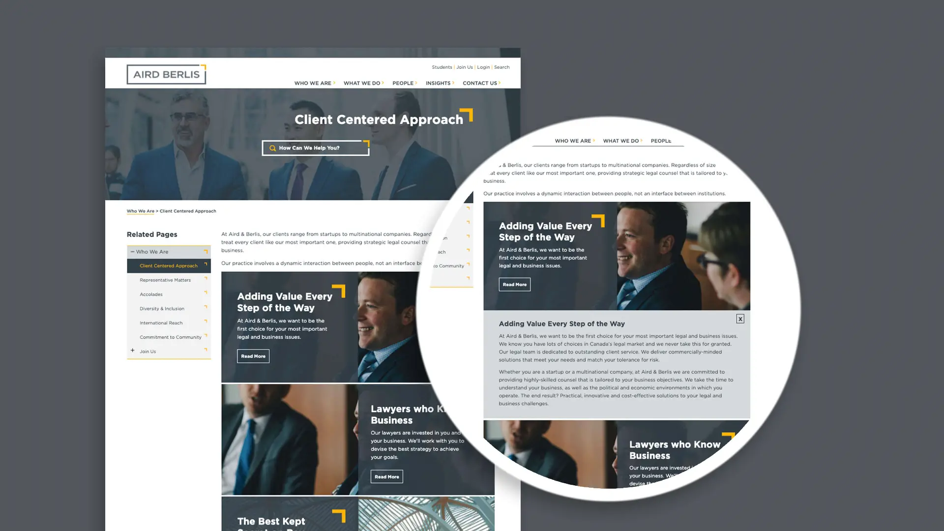 To achieve the firm’s goals, we needed to get a clear sense of Aird & Berlis’s needs, unique selling points, and personality. We interviewed their executive team for vision and direction and 200 lawyers to effectively customize their bio and practice area content. We also audited their website, marketing materials, and competitor websites, to develop new content with high search, client, and brand-value.