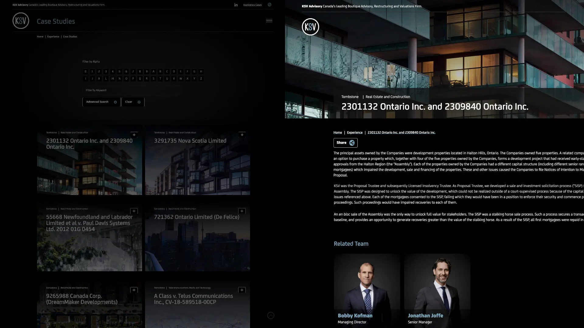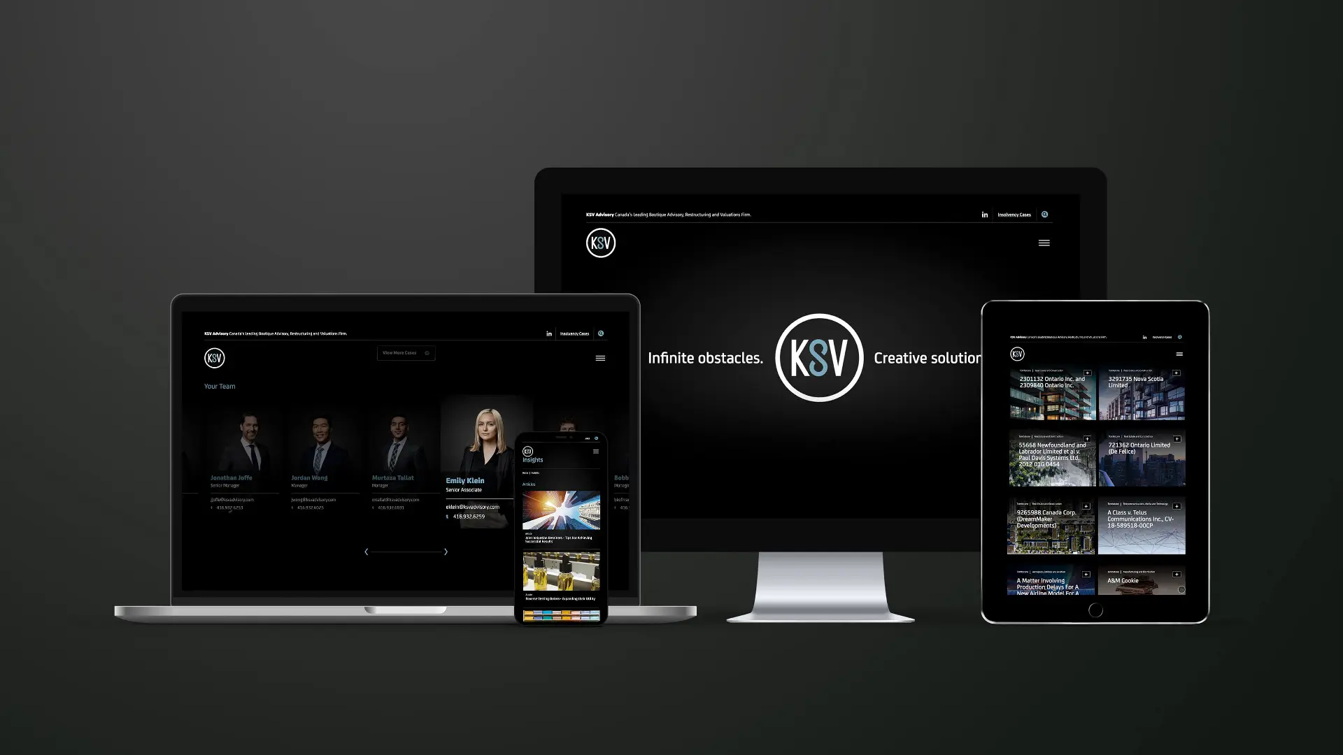In addition to investigating, articulating and promoting KSV's brand position, Cubicle Fugitive rethought and reimagined the KSV website. We worked with the firm to refine and define the firm’s new service and industry pages, reevaluated how to best represent the firm’s frequently accessed Insolvency Cases, and created an entirely new case studies module that highlighted their significant and sophisticated mandates and matters. Our brand and writing team worked with the KSV Managing Directors to craft new brand messaging, professional profiles, and provide guidance on the firm’s new case studies and expertise content.