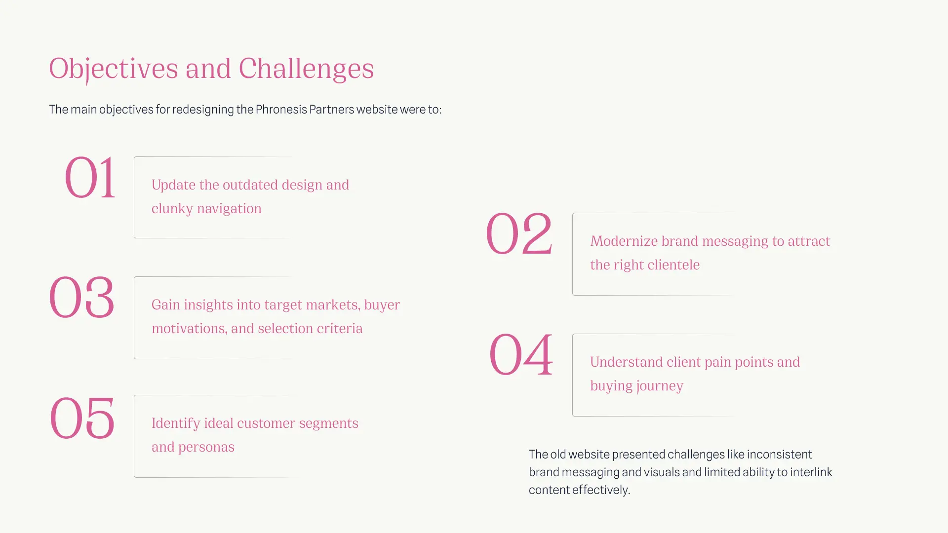 The main objectives for redesigning the Phronesis Partners website were to: