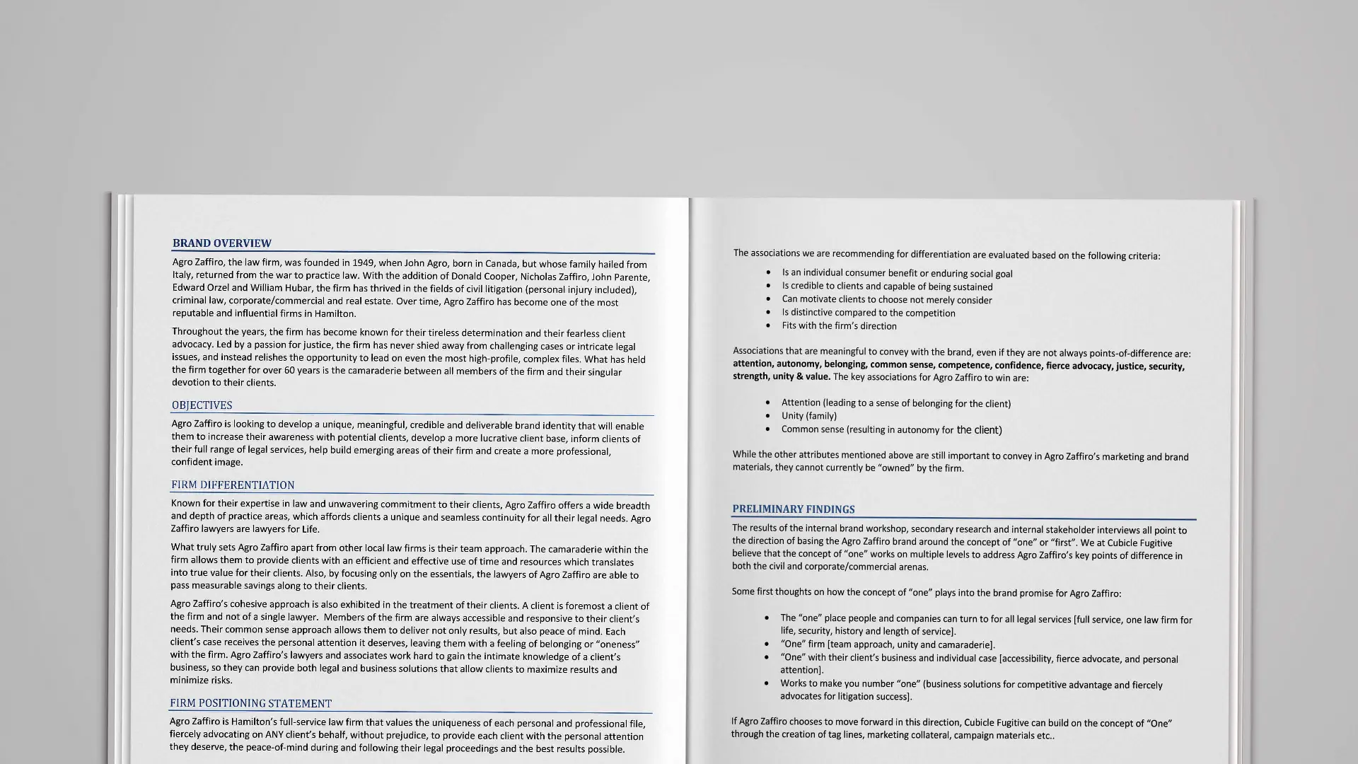 Agro Zaffiro was looking to develop a unique, meaningful, credible, and deliverable brand identity that would enable them to increase their awareness with potential clients, develop a more lucrative client base, inform clients of their full range of legal services, help build emerging areas of their firm, and create a more professional, confident image. They turned to Cubicle Fugitive to help.