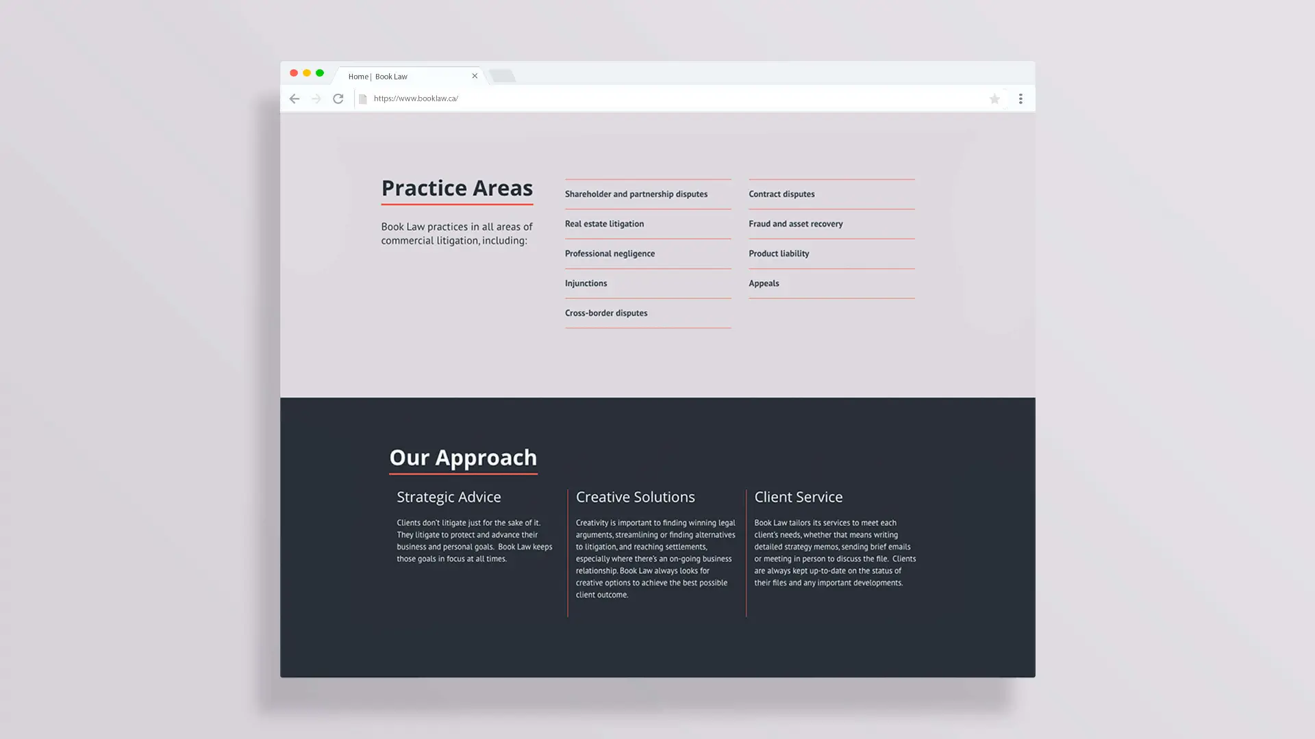 Having worked with Hilary Book, a prominent Toronto litigator, at her previous firm, she sought out Cubicle Fugitive’s help when it came time to start her own practice. Hilary came to us with a clean and professional wordmark and new brand colour but wanted our help with a new website and key messaging.