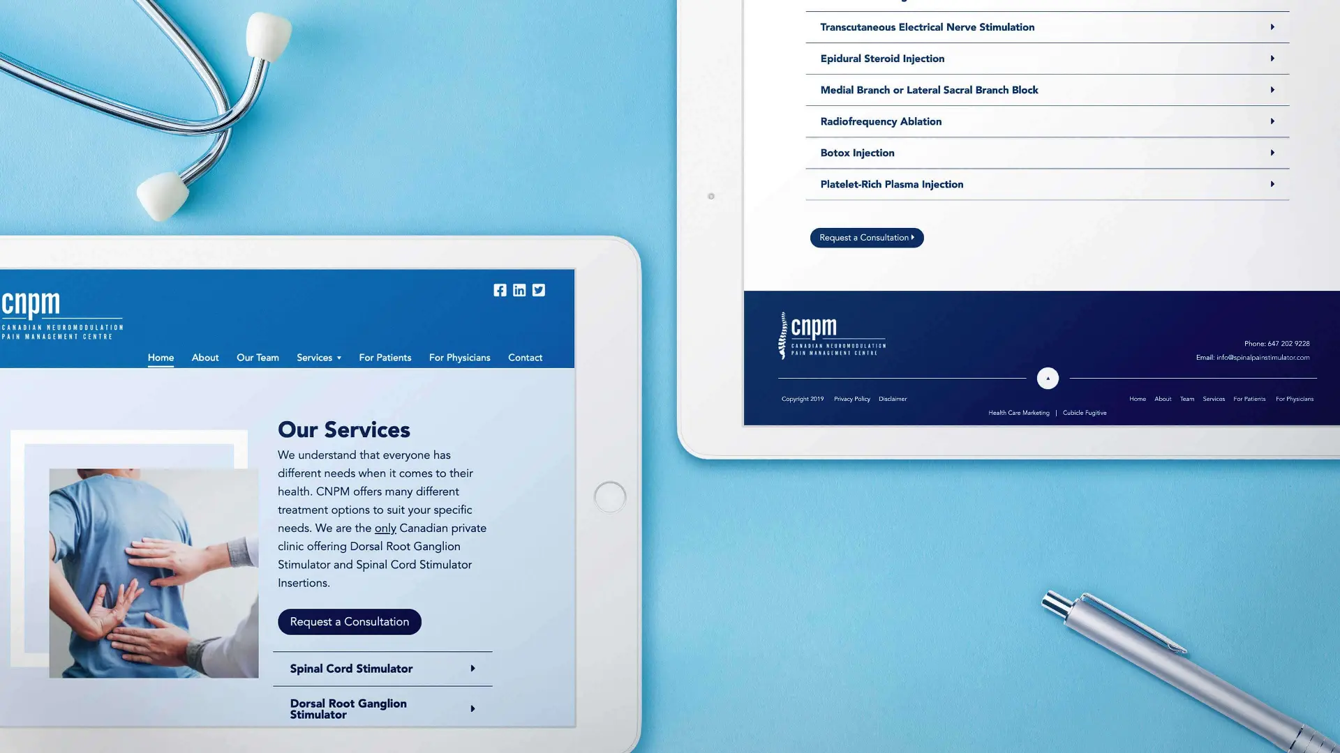 The two main target groups for the Canadian Neuromodulation Pain Management Centre are new and existing patients, as well as physicians. To create a more personalized and targeted experience, the website features a page for patients, and one for physicians. The patients section contains patient forms, detailed instructions on what to expect at the initial appointment, as well as during and after procedure care. The physicians section includes a brief introduction to Dr. Hong, along with a list of pain conditions that he specialized in, and instructions for submitting consultations.