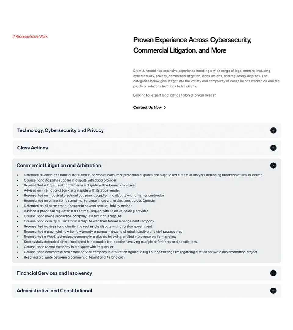 - Representative work organized by practice area in an accordion format, allowing easy navigation across Technology, Class Actions, Commercial Litigation, Financial Services, and other domains.