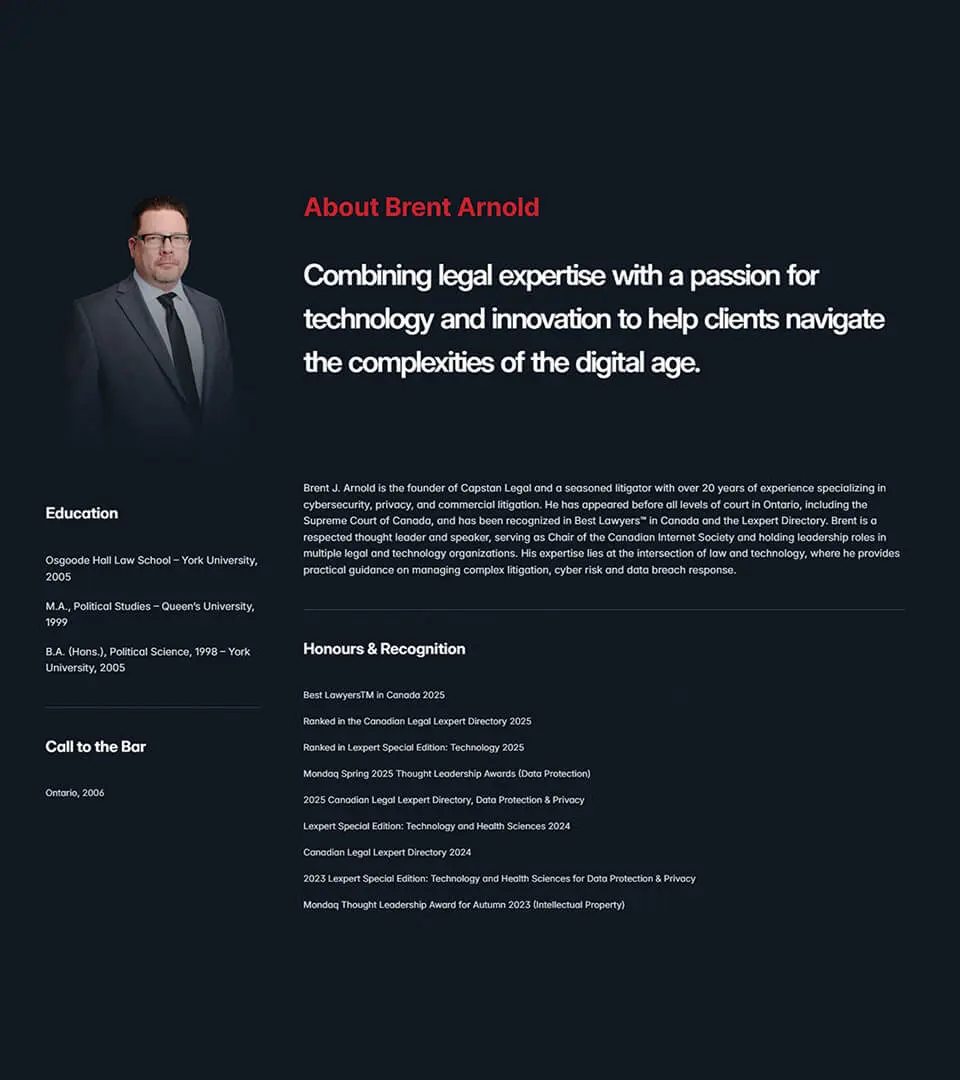 - Founder profile section showcases Brent J. Arnold’s career highlights, blending legal expertise with a passion for technology and innovation, including his involvement with organizations such as the Canadian Internet Society and education, honours, and recognitions.