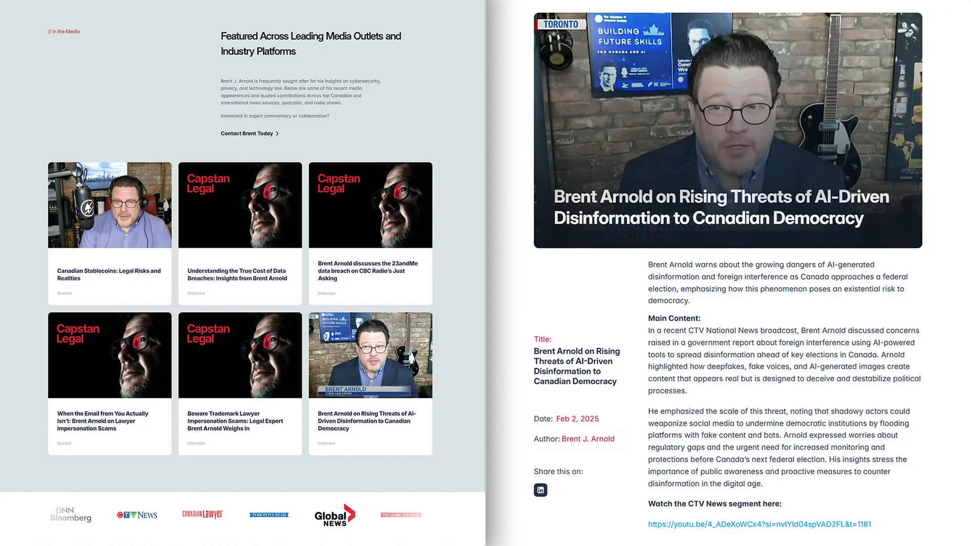 - Dynamic media carousel highlighting Brent’s media appearances, including panels, podcasts, and news articles, reinforcing his credibility as a subject matter expert.