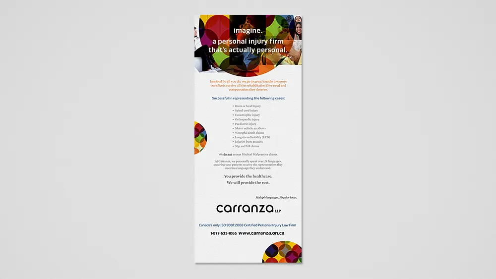 Cubicle Fugitive created pop-up tradeshow banners, tablecloths and giveaways for Carranza LLP. The banners highlighted the firm’s new branding, the types of cases they handle, the languages they practice in and contact information. The firm has used these materials to promote their firm for many years.