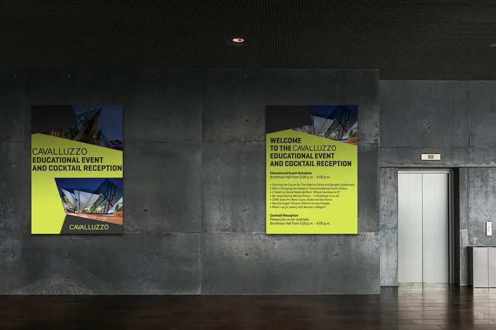 In addition to firm signage, we have also designed event signs for the firm over the past fifteen years. When Cavalluzzo held an educational event for clients they turned to Cubicle Fugitive to help brand the event with invitations and event posters.