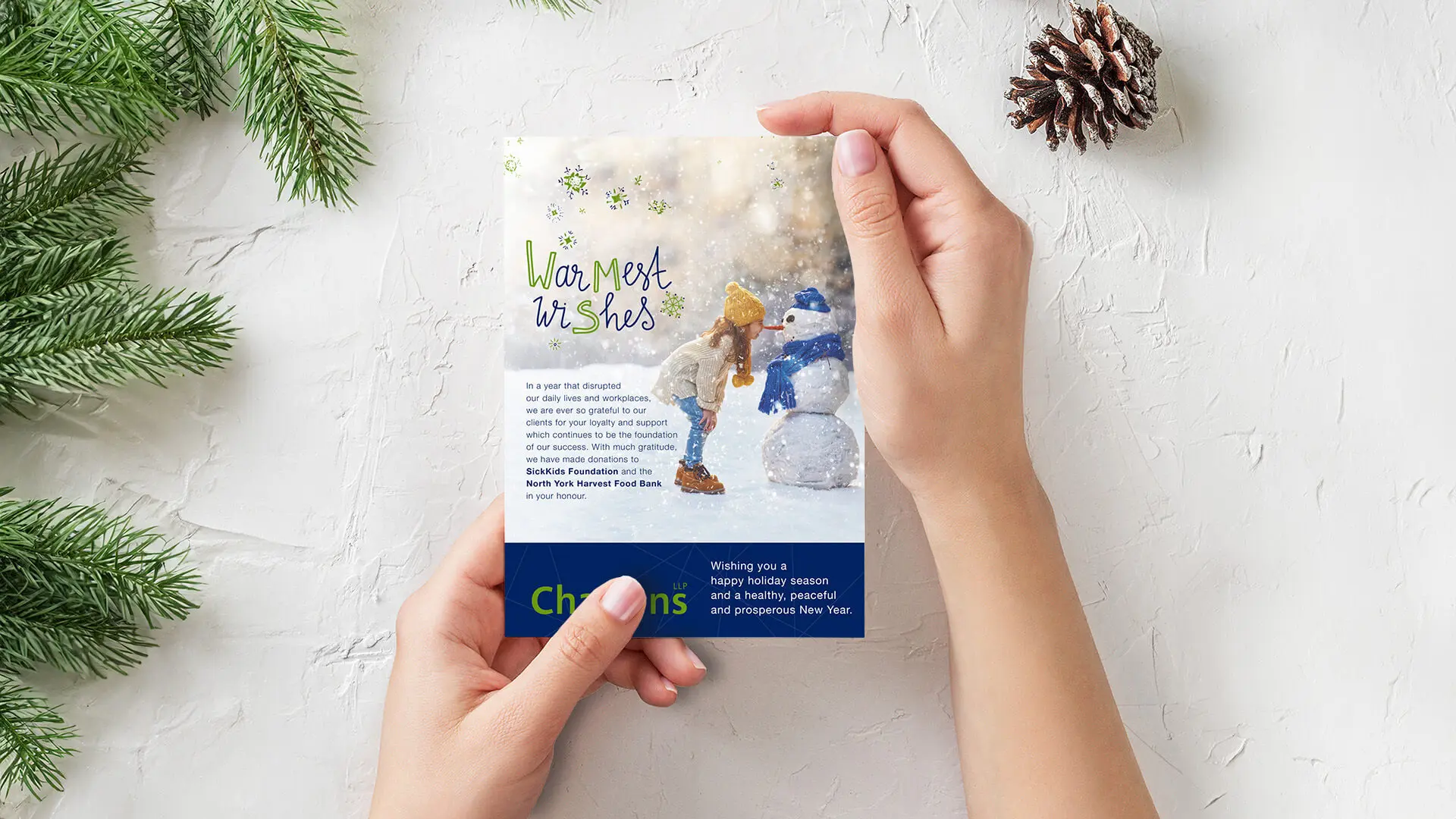 Since 2013, Cubicle Fugitive has worked with Chaitons to produce their holiday cards. Moving away from costly custom cards towards an electronic holiday card, the firm was able to donate more funds to worthy charities such as SickKids Foundation.