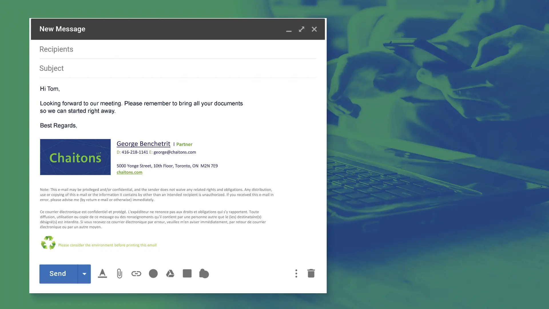 Collaborating with the firm’s long-time printer, we created a suite of new stationery including printed business cards, letterhead, envelopes, and note cards as well as an electronic version of the letterhead and email signature. To create a bright and punchy business card, we applied the firm’s new blue colour and abstract patterning on the back of the card and the result is distinct and memorable. Balance is achieved on the front of the card, electing for a crisp and professional standard white background to feature key contact information. Occasionally, the firm commits to send communications with a personal touch. Together, we created a versatile and professional note card to be sent out to colleagues, partners, and current and potential clients.