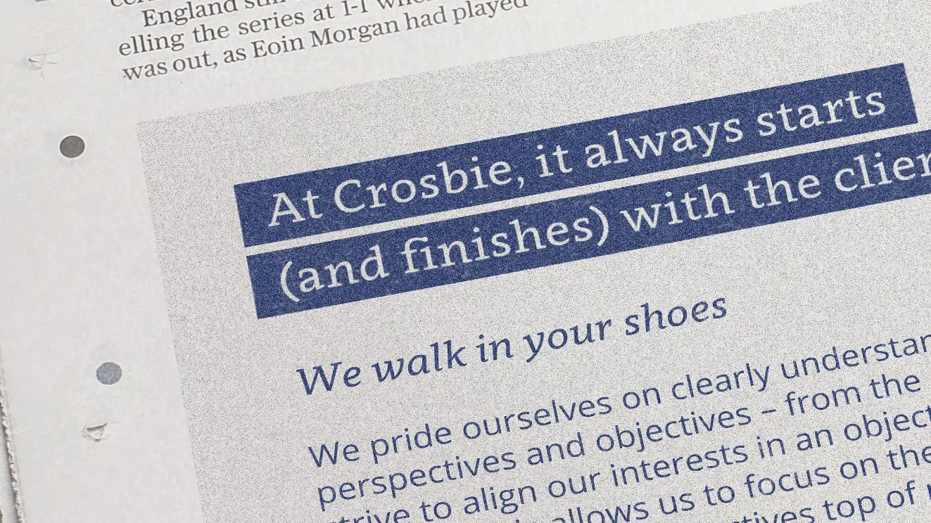 Crosbie hired Cubicle Fugitive to help investigate, articulate and promote a brand position that was meaningful to both referrals as well as current and potential clients. As part of this process, we interviewed the firm’s people and their blue-chip clients, performed an exhaustive review of all internal and public documentation, audited several competitors’ websites, and consulted best practice industry research to help devise and articulate a brand positioning for the firm.