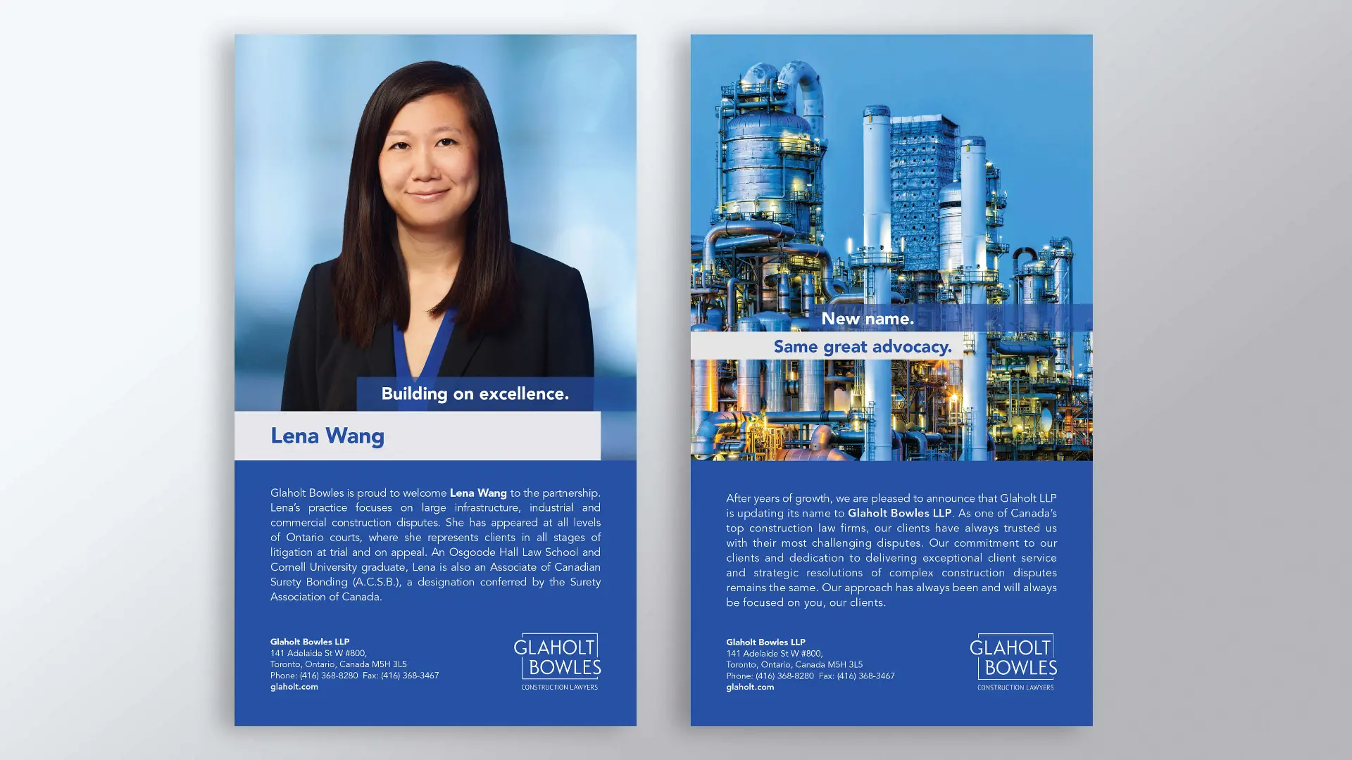 Following our re-brand of the firm, we also developed a new advertising campaign that is focused on the firm’s clients and incorporates some of the strong new headlines developed for the firm. As part of the brand launch, we wrote and designed a new firm name announcement and partner ad. We also designed a lawyer group ad to highlight their accomplished team of lawyers while simultaneously showcasing the firm’s refreshed brand identity. We look forward to rolling out the firm’s campaign in the coming months.