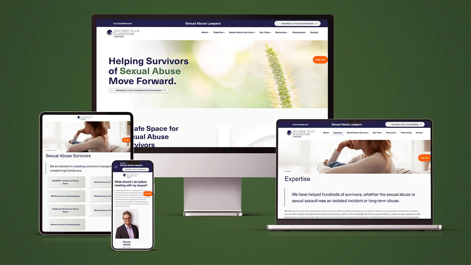 Following the success of the Sixties Scoop Microsite, Senior Counsel and sexual abuse lawyer Simona Jellinek requested a microsite tailored to the firm’s sexual abuse practice group. Before beginning the design process, we analyzed site analytics, conducted competitor research, and identified best practices to create a user-centric experience. The resulting structure features streamlined navigation and carefully categorized content, ensuring visitors can easily find relevant information while staying within a focused, secure environment that fosters trust.