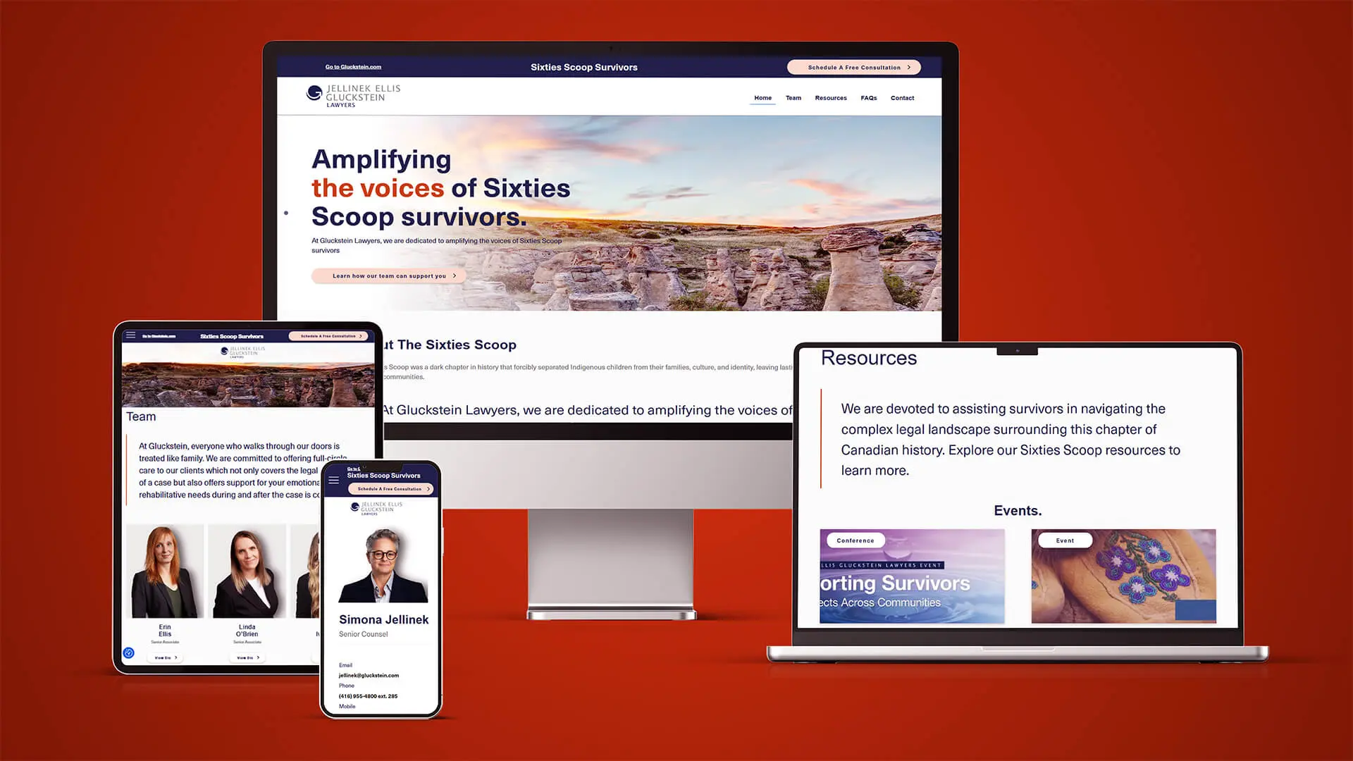 We partnered with Gluckstein Lawyers to design, develop, and launch a dedicated microsite for Sixties Scoop survivors, amplifying their voices and providing a platform for legal support and healing. This comprehensive resource hub guides survivors through available support services, clarifies their legal options, and keeps them informed about relevant events and updates. It also provides guidance for those who experienced abuse in foster care, adoptive homes, or institutions during childhood.