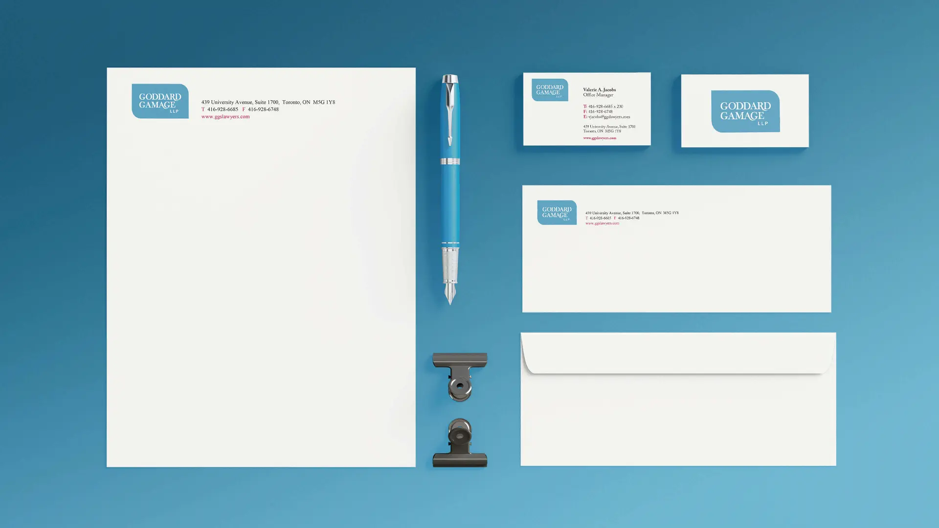 After rebranding Goddard Gamage LLP, Cubicle Fugitive designed new business cards for the firm, incorporating their newly designed logo and accent colours. We created a simple, clean, and modern new suite of stationery that was available in an electronic version for the firm’s lawyers. The new business cards were printed on a highly tactile paper for interest.