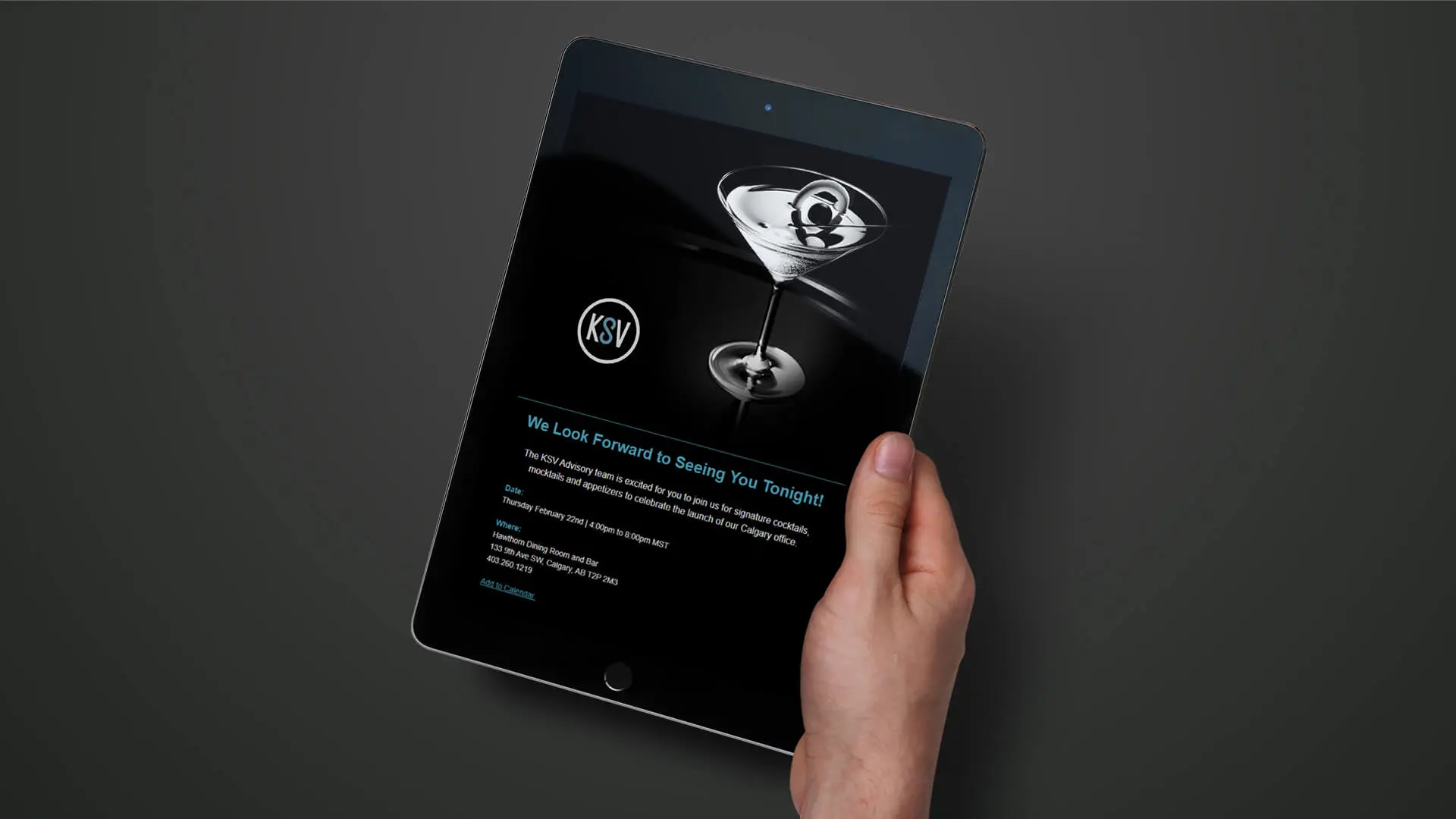 KSV also held a launch party in Calgary to celebrate the grand opening of their new office. In partnership with Cubicle Fugitive, we designed a personalized invitation and reminder email for KSV that incorporated technology to gather and track RSVPs for the advisory’s internal team.