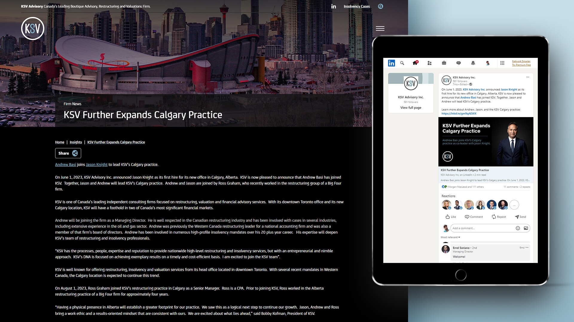 KSV Advisory, a leading financial advisory, restructuring and valuations boutique, announced the opening of their new office in Calgary, Alberta, in 2023. To effectively communicate this news to their team and clients, KSV partnered with Cubicle Fugitive to create a series of communications pieces for the firm’s website and social media.