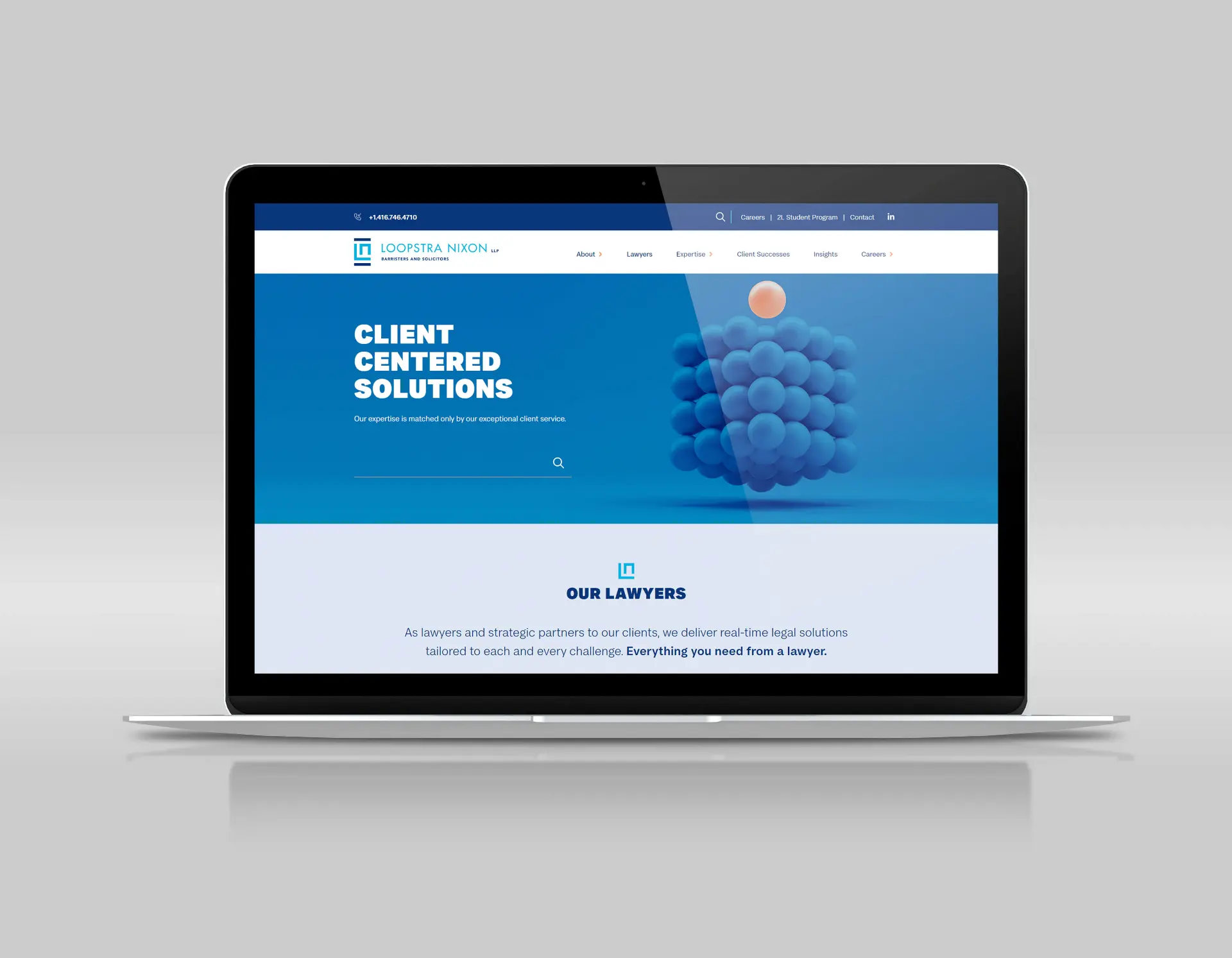 The “big idea” came from the Loopstra Nixon brand attribute of being client-focused. As a firm, part of their brand difference is that they are client-centred. This overarching theme can be seen within the orange pop of colour used to represent their approach to client communications. This idea was translated onto the inside pages of the website, where the orange ball is always the focus, showing how the firm stands out amongst their competitors (being the orange ball in a sea of blue).