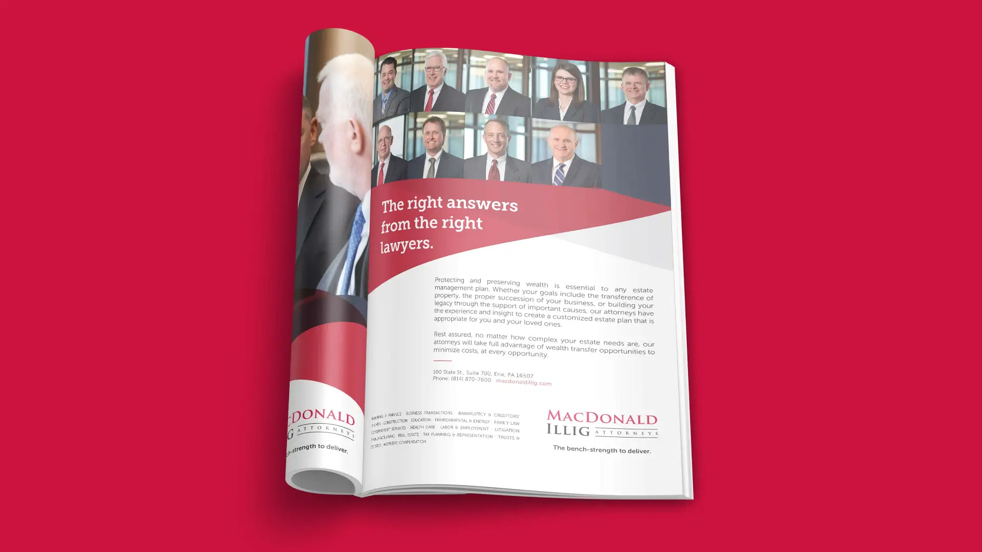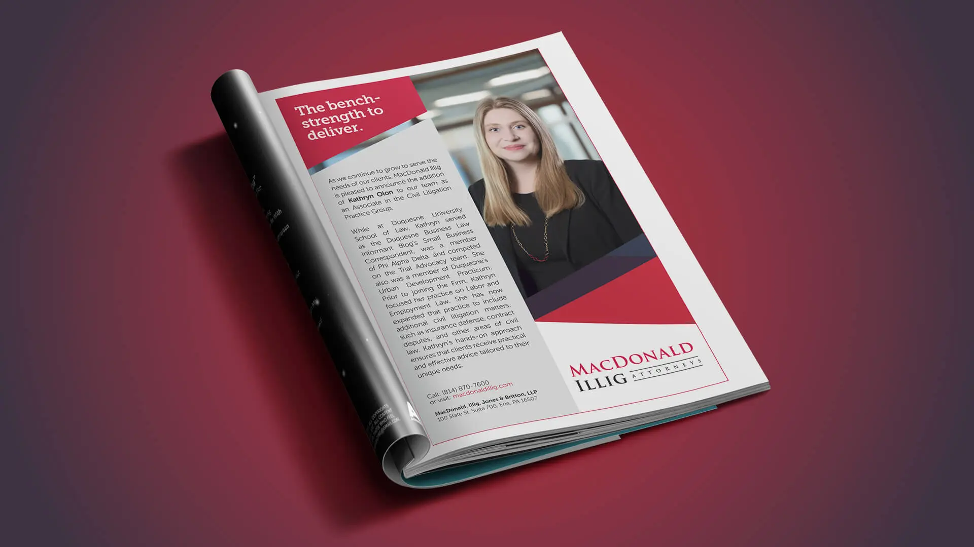 Brand ads were established and executed first, to market the firm to the wider business community. Our team then created sponsorship ad templates that highlighted the charitable support that MacDonald, Illig, Jones & Britton, LLP provides, while emphasizing the importance that their chosen charities and organizations serve in the community. Finally, the Cubicle Fugitive team developed new attorney ads that spotlight the breadth and depth of knowledge the lawyer brings to the firm and practice.