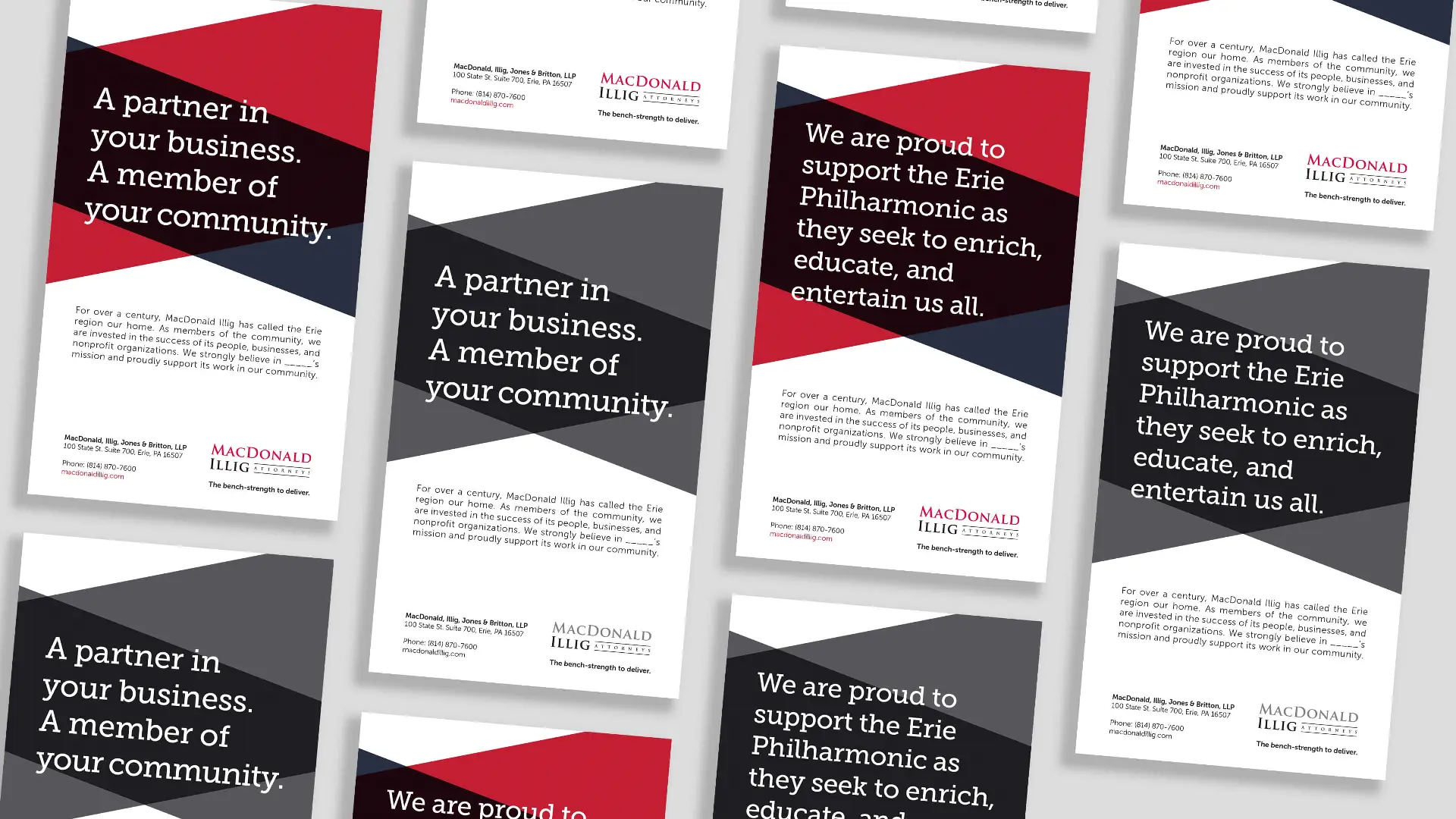 After launching their new website, the firm wanted to update their sponsorship, support, and firm advertising to match their refreshed brand. With a strong in-house marketing team, MacDonald, Illig, Jones & Britton, LLP required a campaign and ad designs that could be updated internally.