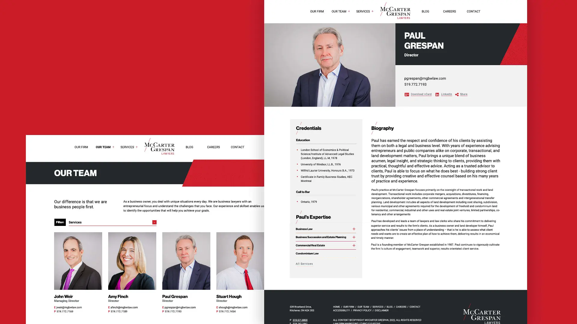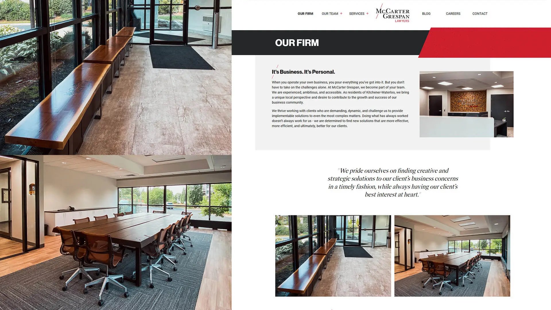 McCarter Grespan Lawyers is a dynamic Kitchener-Waterloo-based business law firm with expertise in corporate real estate and condominium law, corporate commercial law, and business succession and estate planning. With the move to a new and centralized office location, McCarter Grespan wanted to ensure their most public-facing asset—their website—was reflective of their modern workspace. Having worked with Cubicle Fugitive in 2015 on their last website, McCarter Grespan engaged our team to design and develop a new online presence reflective of their modern approach to practicing law.