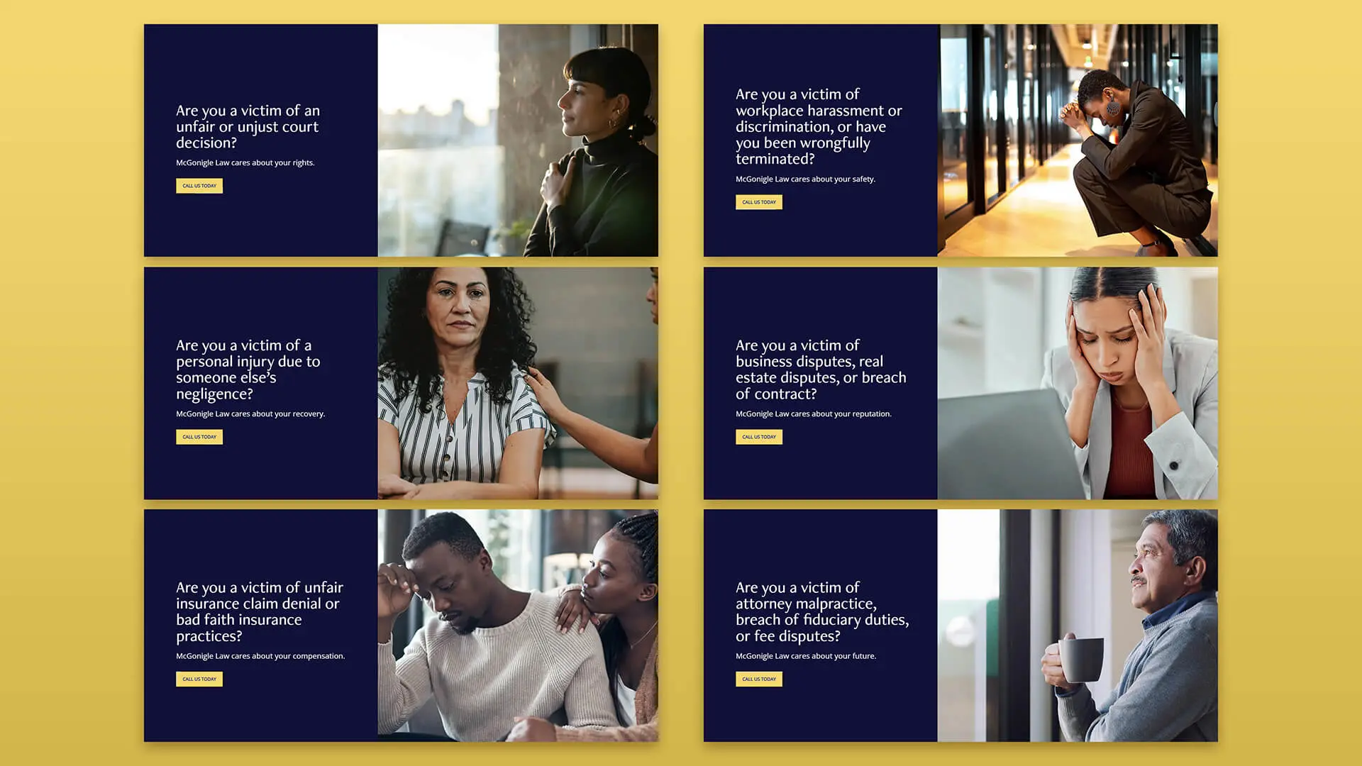 Given the firm’s strong focus on B2C work, we strategically made the homepage messaging clear, direct, and impactful. We created a series of rotating banner headlines built around a question + statement format (e.g., “Are you a victim of attorney malpractice, breach of fiduciary duties, or fee disputes?” “McGonigle Law cares about your future.”), paired with compelling calls to action. This campaign approach was designed to immediately connect with users, speak to their legal concerns, and encourage them to take the next step—whether it’s learning more or getting in touch.