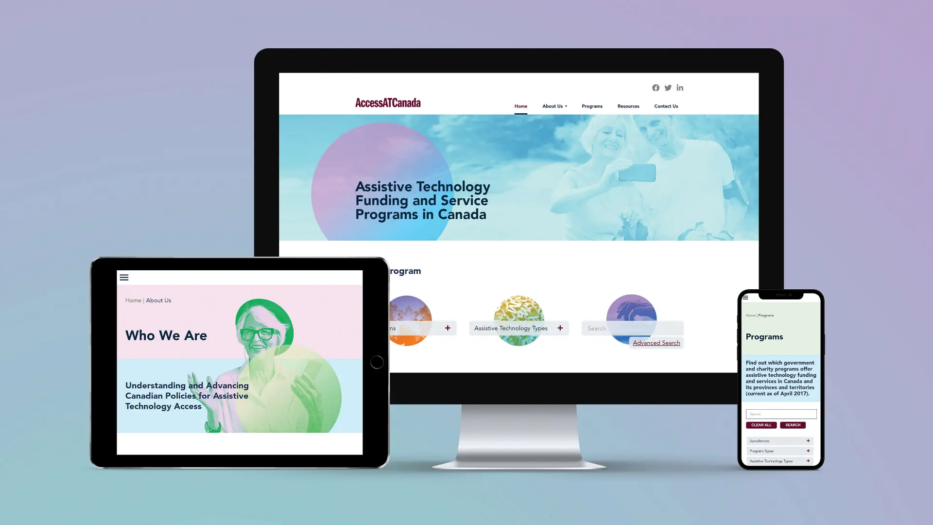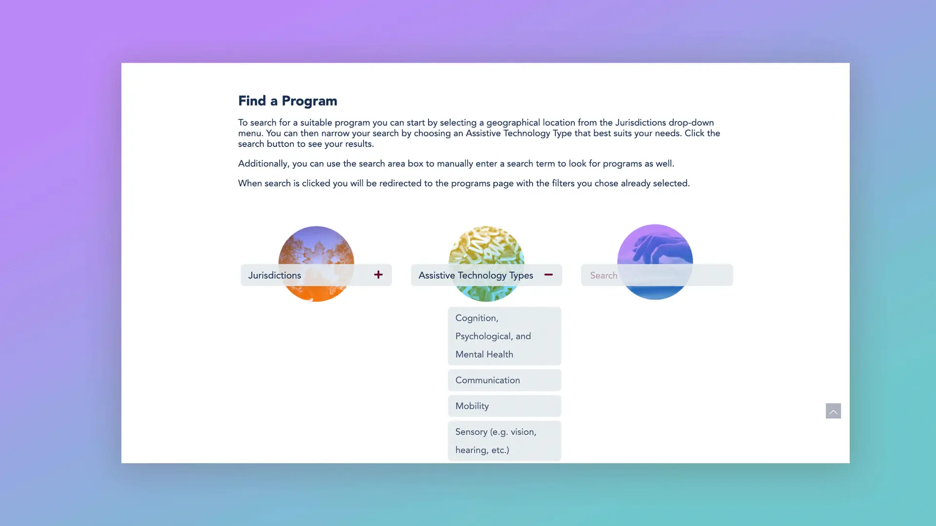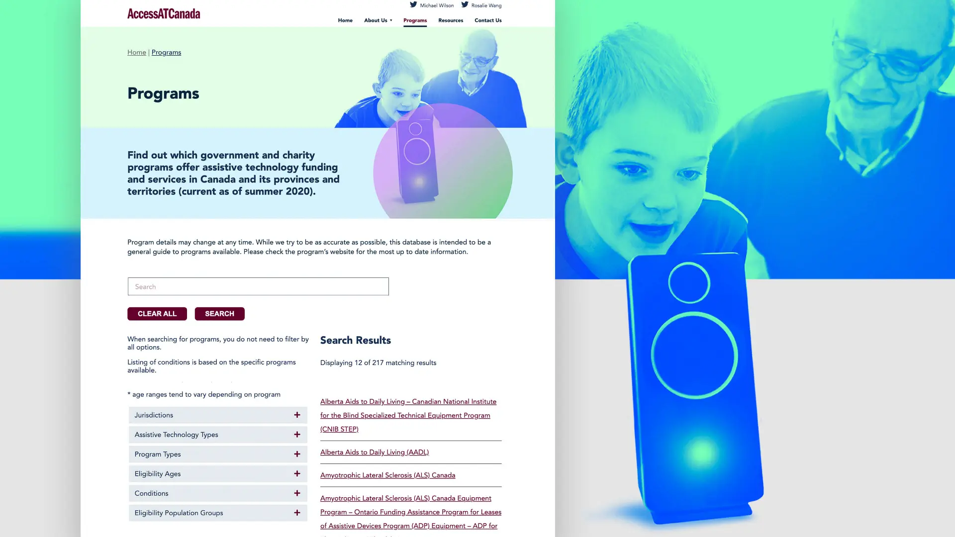 The main focus of the website is to provide an easy to use database of government and charity programs that offer assistive technology funding and services in Canada. The homepage allows visitors to find a program through various methods including jurisdiction, assistive technology types, a keyword search, or by using an interactive map. Once a type is selected, the user is then redirected to the programs page which automatically filters the programs based on their search query. From here the user can further filter their results by age and eligibility.