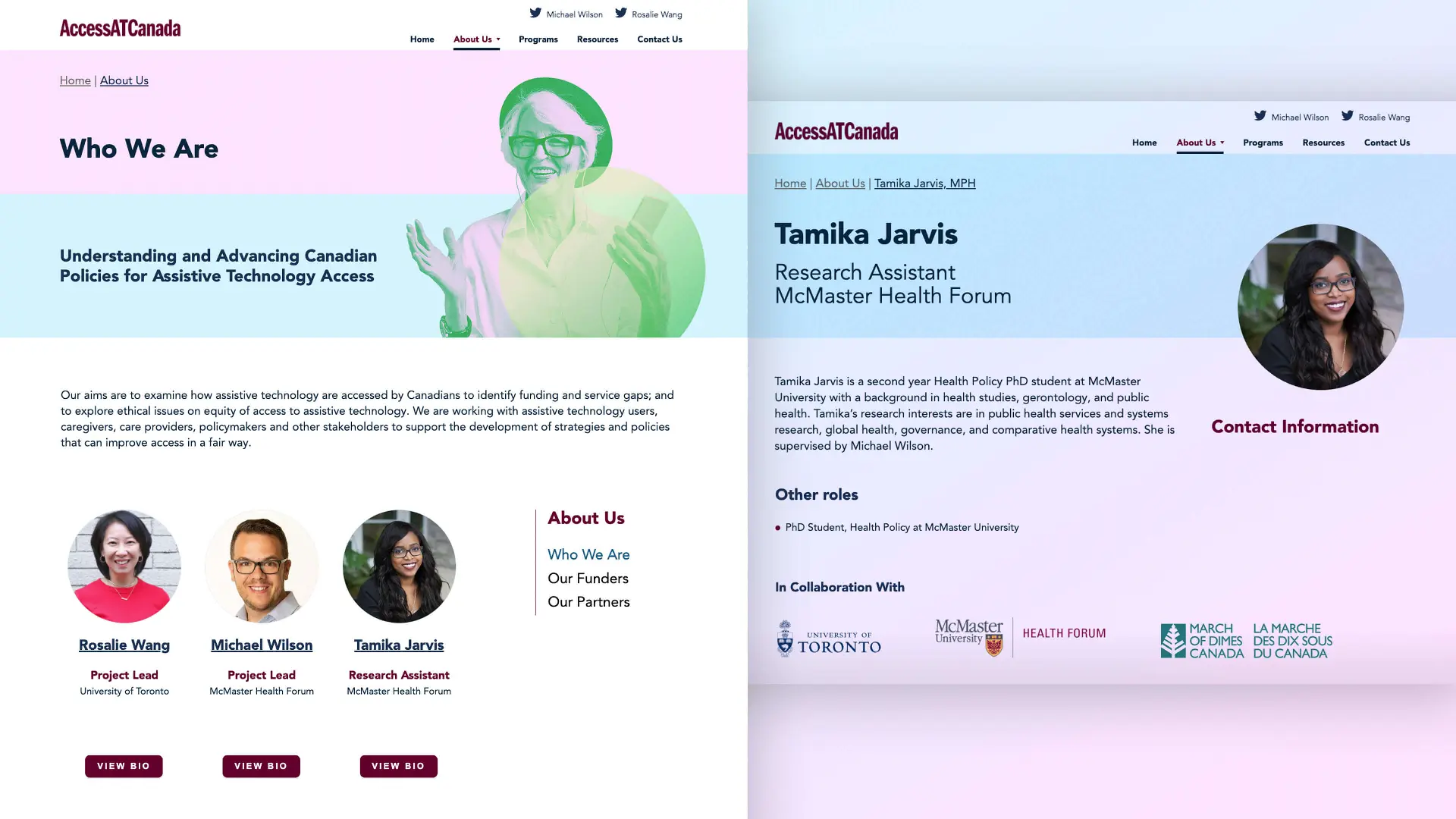 AccessATCanada would not be possible without the collaboration of McMaster Health Forum, the University of Toronto, and March of Dimes, as well as the team involved in taking the lead on this funded research project. In addition to the programs page, Cubicle Fugitive also developed a team database that features each member’s biography, their organization, and any related activities or outputs that highlight their involvement and their dedicated research related to assistive technology.
