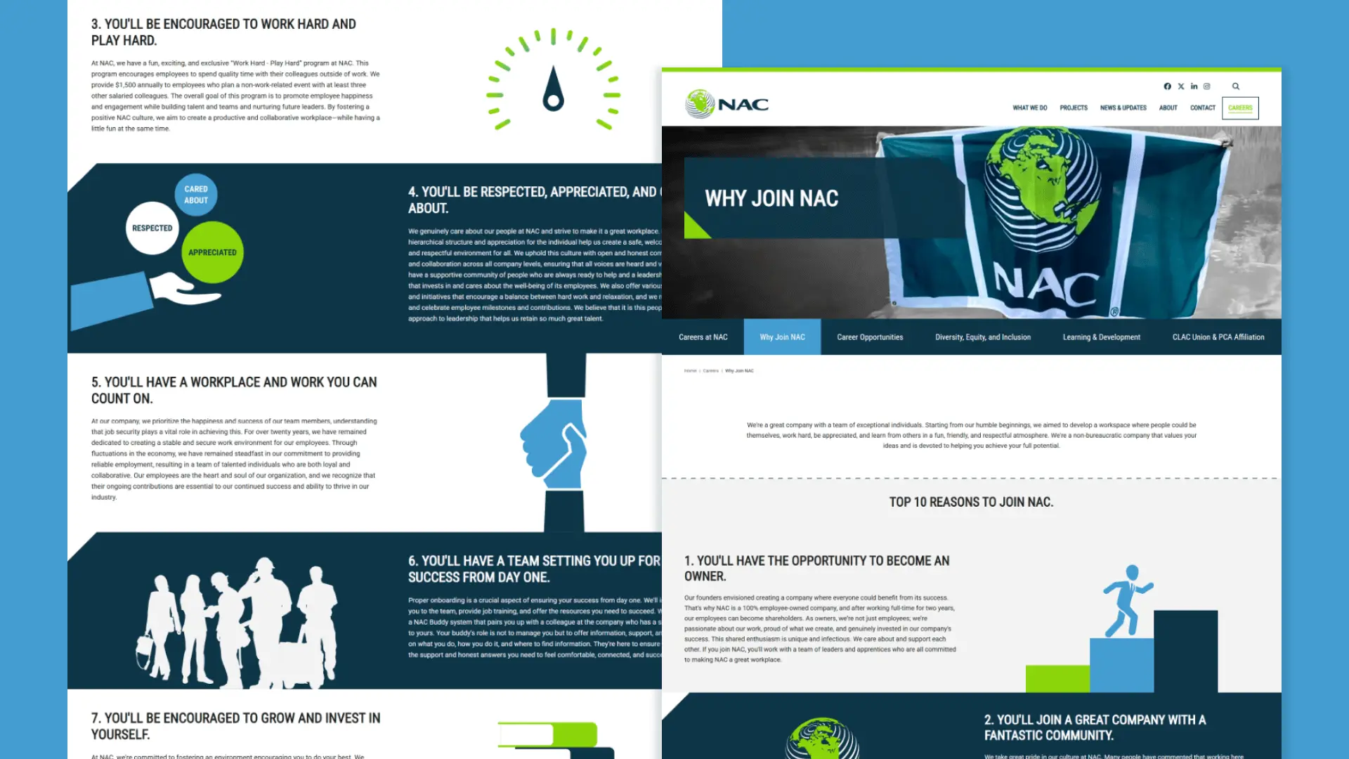 NAC approached Cubicle Fugitive to refresh its existing website and overall brand positioning. Its goals were twofold: to more accurately reflect the company’s unique approach to construction projects and to elevate their status as a leader in people management, making the company an attractive choice for clients and potential recruits.