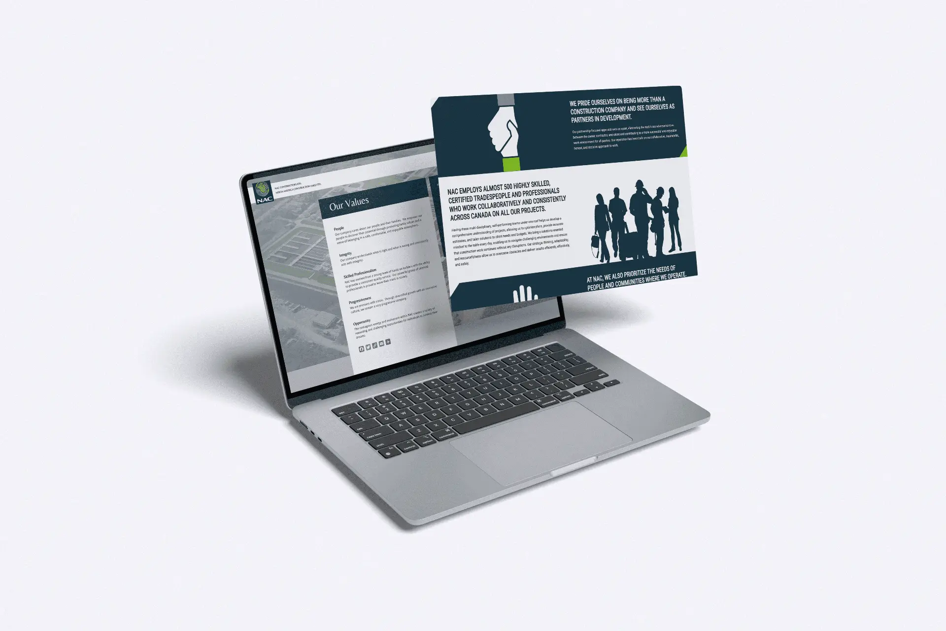 A dedicated ‘Commitments’ section was developed to demonstrate NAC’s dedication to Safety, Diversity, Equity and Inclusion, Quality Work, and People Development. This module incorporates custom illustrations and graphics to effectively communicate these value propositions through both text and visuals.