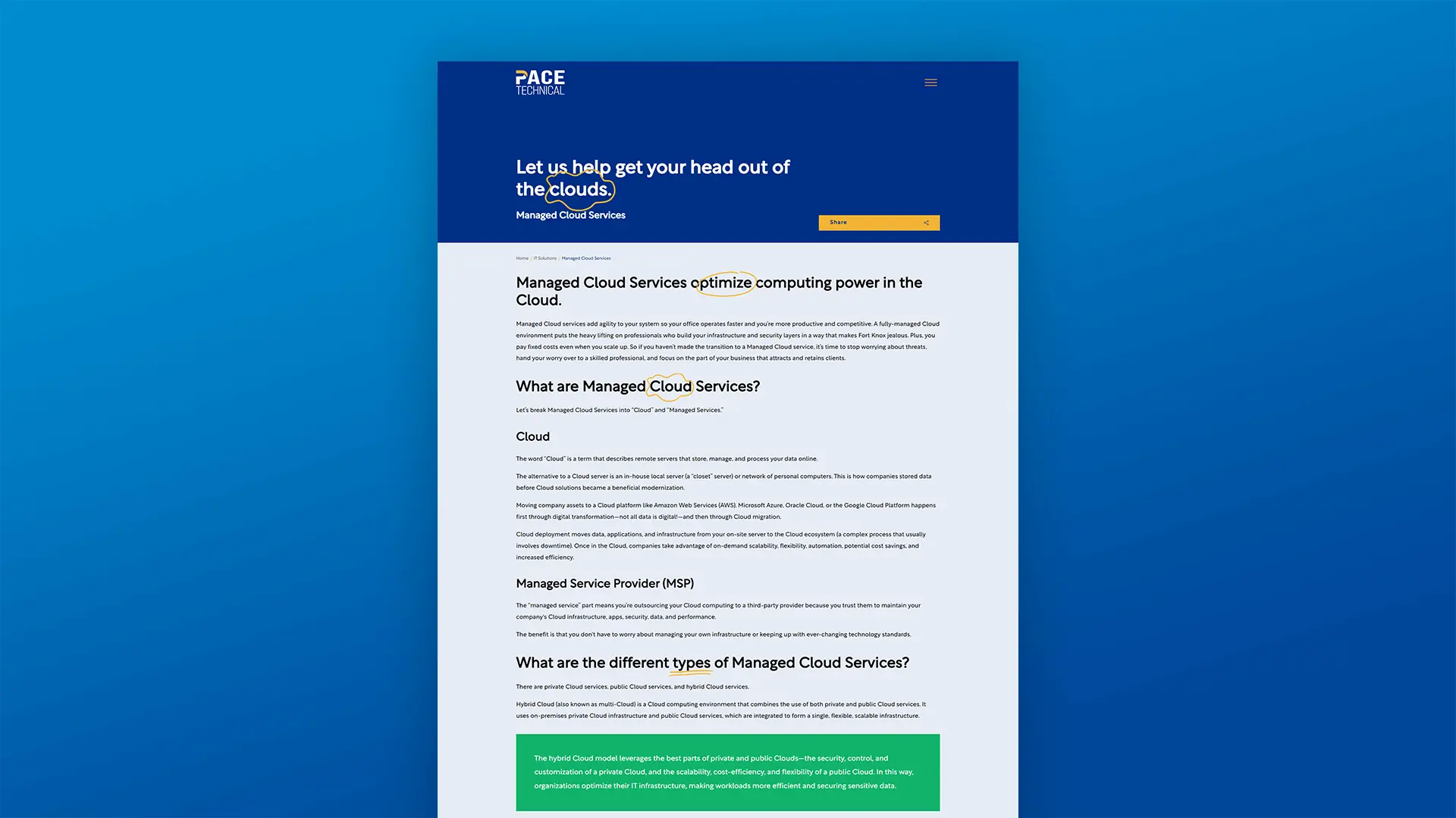 Each page dedicated to IT services and solutions was meticulously designed to inform, engage, and establish trust, making it easier for visitors to schedule consultations. Industry-specific pages were crafted to demonstrate PACE Technical’s comprehensive understanding of client needs, showcasing their capability to address current issues and anticipate future opportunities.