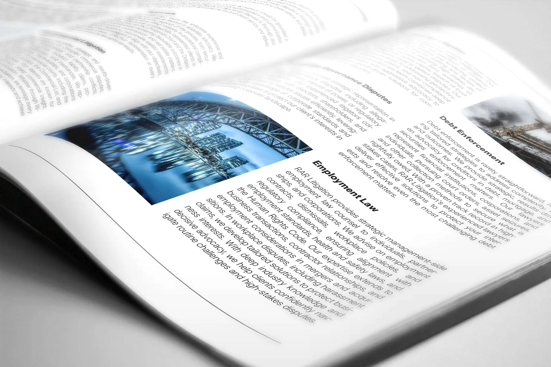 RAR Litigation partnered with Cubicle Fugitive to develop two professional brochures that effectively communicate the firm’s expertise and value proposition. The first brochure was an All-Practice Areas version showcasing the full range of services, and the second brochure was a specialized Construction Practice version focusing on the firm’s key sector.