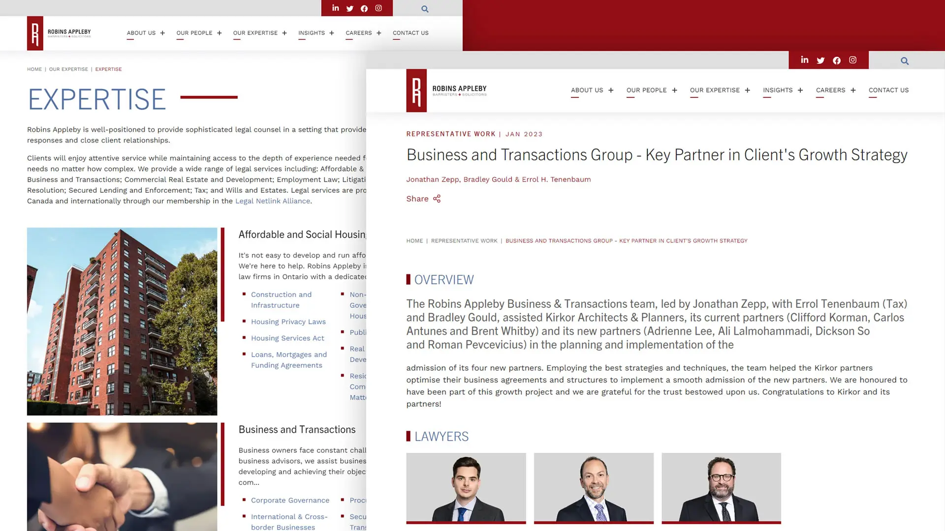 Robins Appleby is a mid-sized, comprehensive Business Law Firm providing a full range of legal services in corporate commercial, estate, tax, litigation, and real estate. Canada's elite often selects the firm’s sophisticated, insightful, and decisive
