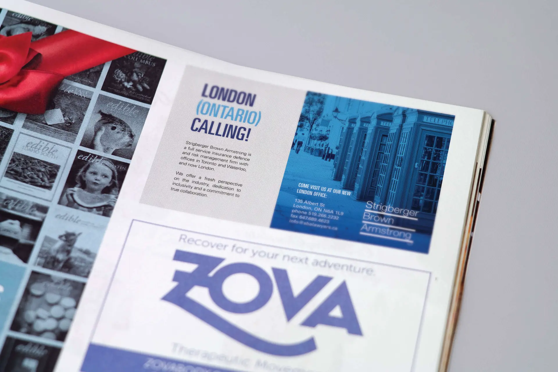 To raise awareness of their newly formed partnership, Cubicle Fugitive worked with SBA to create an ad and a postcard that would be used to promote their London office. Both the ad and postcard feature the firm’s branded blue throughout the design, as well as a bold and eye-catching headline.