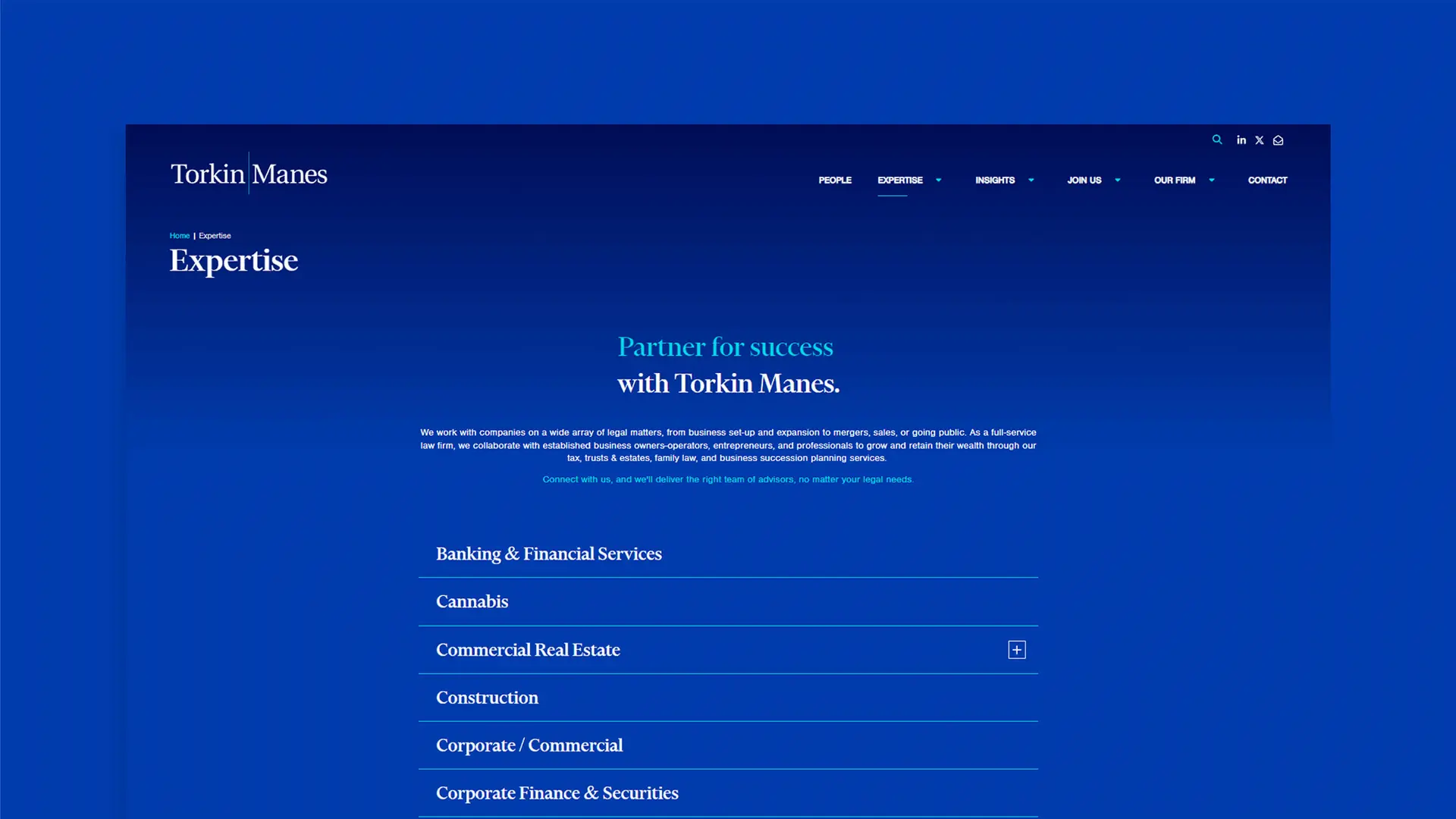 Torkin Manes’ proficiency inspired the redesign strategy in delivering concise, practical solutions to its high-achieving clientele. We aimed to develop a contemporary, minimalist website that clearly emphasizes the firm’s value proposition. The design featured new fonts, colours, and custom elements, providing a refined and seamless online user experience. The stock photographs used throughout the site all depicted Toronto from a low vantage point perspective, creating a cohesive visual flow that aligned with the firm’s strategic direction. Additionally, the firm captured custom candid photos of their team for the “Join Us” section, enhancing the personal touch of their branding.