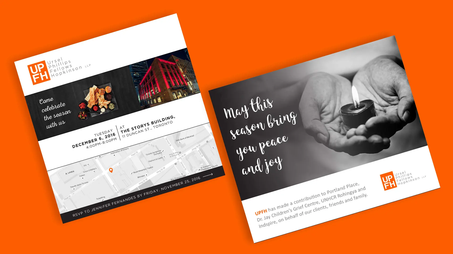 Since 2013, Cubicle Fugitive has worked with UPFH to help promote, celebrate, and commemorate the holidays. Each year, the firm hosts a client event and we have the honour of working with them to design and develop invitations, any on-site signage, and a corresponding holiday card to thank their clients for the previous year and wish them well for the following one.